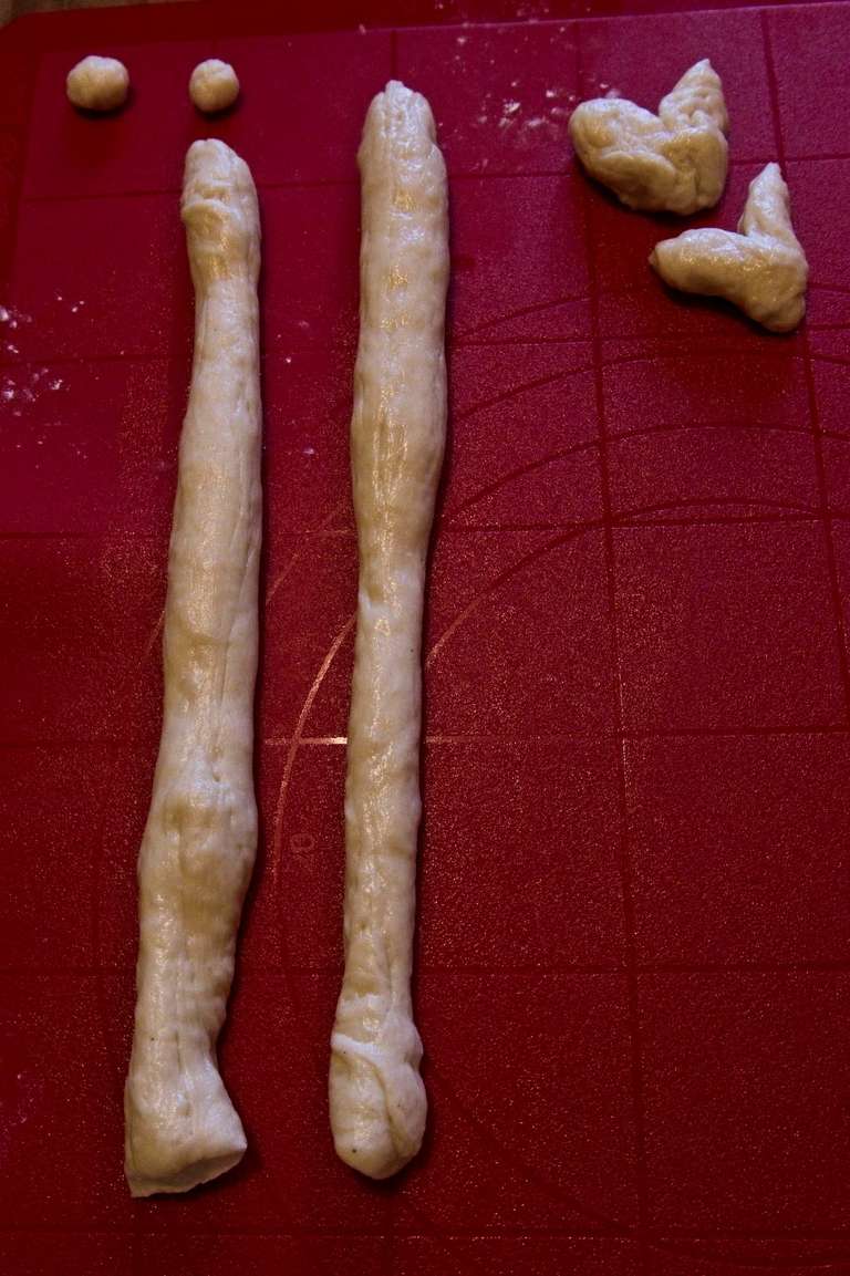 - Dividere ogni porzione in tre parti: una piccolina per la coda, una leggermente più grande per la testa e circa due terzi per il corpo.