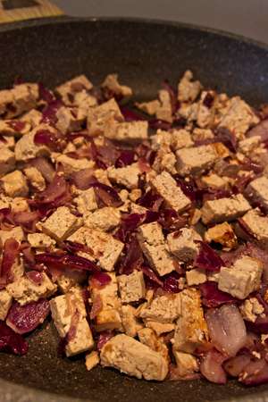2. Spelare e tagliare finemente le cipolle. Farle soffriggere in una padella larga con dell'olio e l'aglio. Aggiungere il tofu tagliato a cubetti e farlo rosolare. Per chi vuole, sfumare con un po' di vino.