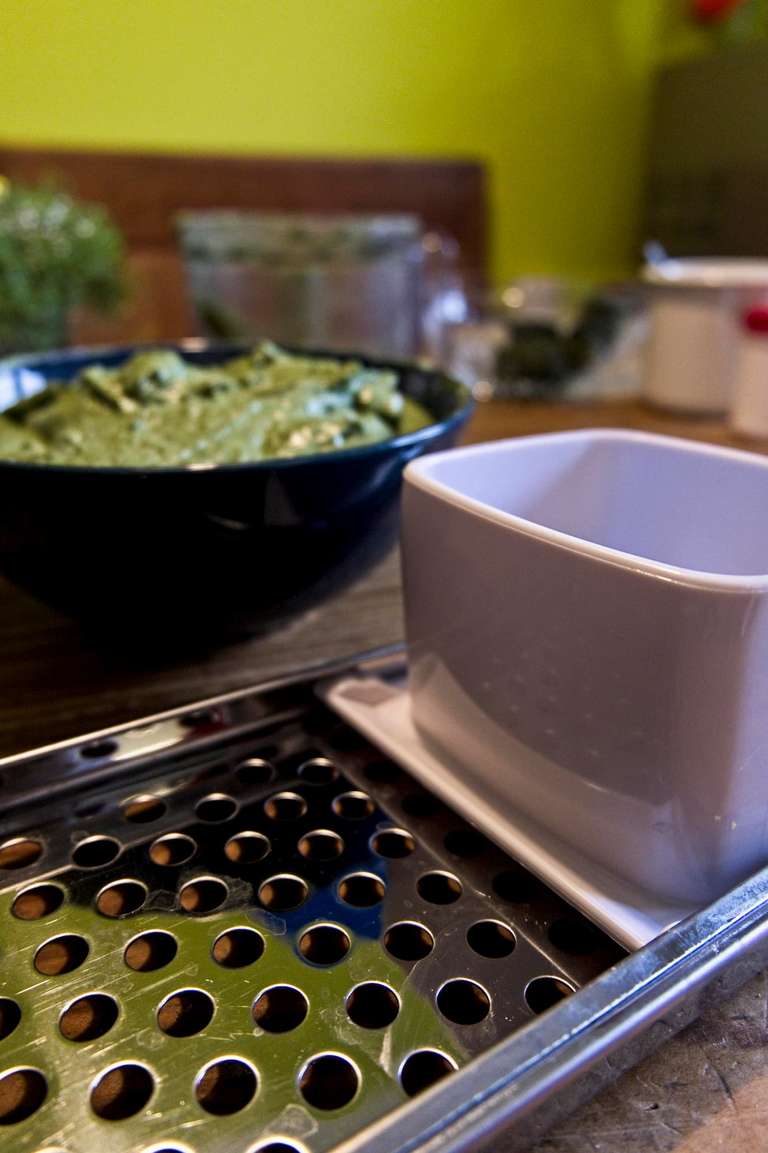Per dare forma agli Spatzlen, l’ideale sarebbe avere la cosiddetta “Spätzlehobel” (grattugia per Spatzle), ma anche uno schiacciapatate a buchi larghi funziona. Altra alternativa è stendere l’impasto su un tagliere e tagliuzzarli in piccoli pezzettini da far cadere subito nell’acqua bollente.