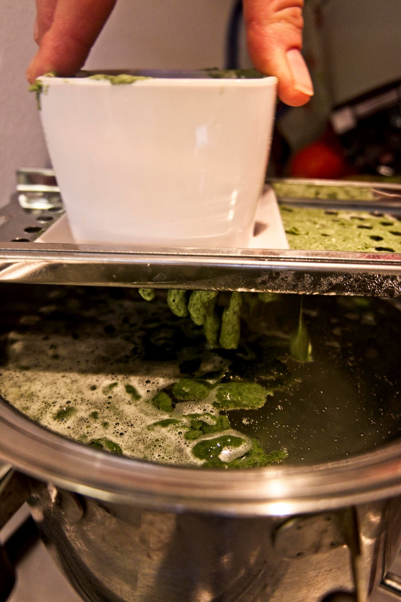 - Far bollire dell'acqua salata in una pentola capiente. A bollore, posizionare la grattugia sulla pentola, versare il composto e formare gli Spatzlen con un lento movimento lineare.