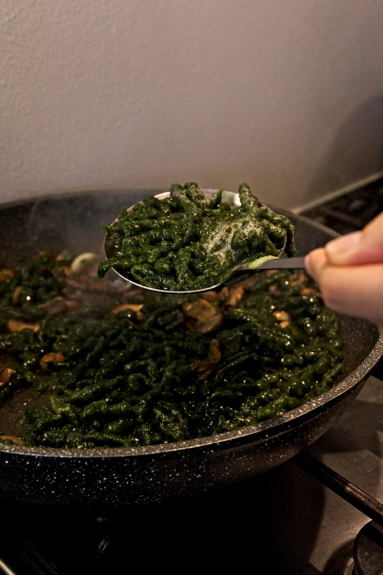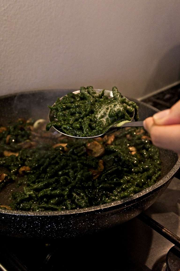 Spinatspatzlen con funghi e panna - Ricetta vegana