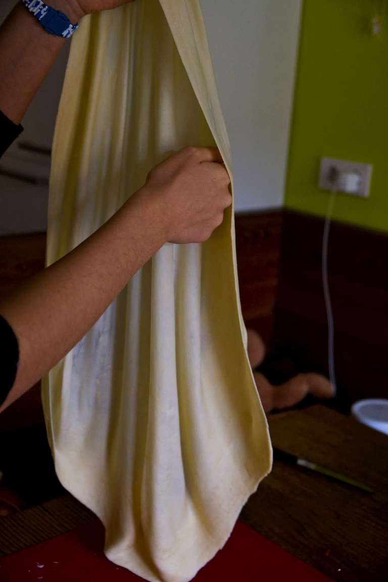 N.B. La quantità di questi ingredienti puó essere variata in base ai gusti. - Stendere l'impasto prima con il mattarello e poi allargarlo con le mani fino ad ottendere una sfoglia sottilissima e possibilmente rettangolare.