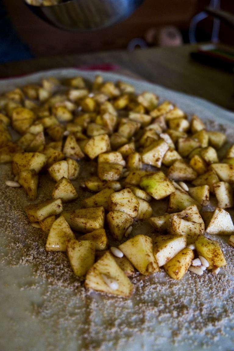 - A parte, pelare e tagliare le mele a cubetti e aggiungere succo di limone, cannella, pinoli, zucchero e a chi piacesse dell'uvetta. Mescolare e coprire con un piatto per far omogeneizzare i sapori.