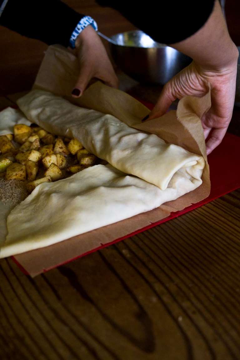 - Ripiegare prima i due lati piú corti e, aiutandosi con la carta da forno, ripegare la sfoglia su se stessa per formare una specie di girella. (L'ideale sarebbe ripiegare il bordo finale sulla parte alta dello strudel per non far fuoriuscire il ripieno.)